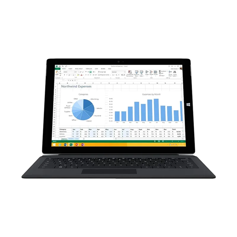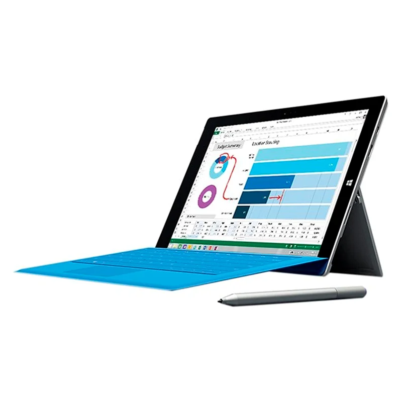 سرفیس پرو ۳ استوک. وضعیت این دستگاه A+. ظاهری تمیز. از نظر فنی سالم و تعمیر نشده. باتری غیر قابل تعویض لیتیوم یونی با ظرفیت ۵۵۴۷ میلی آمپر ساعت با کارکرد حداکثر ۹ ساعت گشت و گذار پی در پی در اینترنت و 7 ساعت تماشای فیلم. دارای اسپیکر استریو. صفحه نمایش ۱۲ اینچی و با کیفیت. صفحه نمایش از نوع ClearType Full HD بوده و با همراهی پنل IPS، زاویه دید خوبی به کاربر میدهد. کیبورد اختصاصی سرفیس موسوم به کاور (Cover)، هم یک کیبورد کامل است و هم از نمایشگر محافظت میکند. این کاور از یک لولای اضافه بهره میبرد که باعث تا شدن لبه بالایی کاور و اتصال آن به بدنه لپ تاپ میشود.